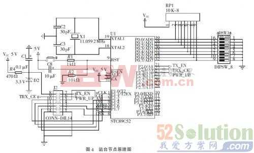站台节点采用STC89C52单片机为微处理器,通过其P0口连接8位拨码开关,实现对各站点的编码标识。NRF905模块与STC89C52单片机之间通过SPI串行外设接口通信,STC89C52 P1.4~P1.7引脚分别与NRF905模块的MISO、MOSI、SCK和CSN引脚相连,通过C程序模拟SPI时序完成数据的传输。站点的标识通过NRF905模块发送。站台节点原理图如图4所示。
