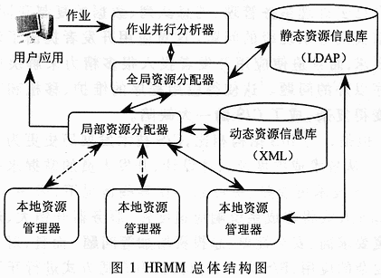 HRMM的设计思想是:动态接收来自用户的作业请求,并为该作业分配符合条件的计算资源,同时提供整个计算过程中有关资源信息的在线反馈,接受用户的在线控制。HRMM的体系结构如图1所示,将计算网格的资源管理任务分为四个层次:作业并行分析、全局资源分配、局部资源分配和本地资源管理。