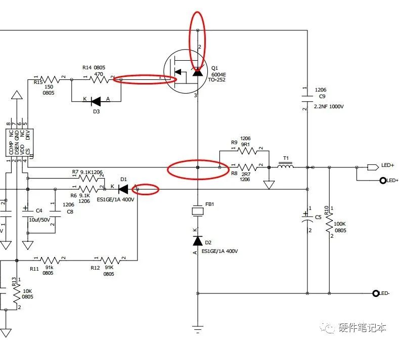 5、整改方案:重点关注高频开关点(如下红色圈处),调整Layout布线设计: