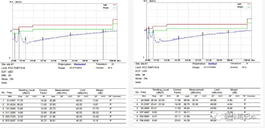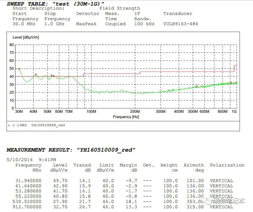 结果:水平测试,余量逼近限度线;垂直测试,31MHz、41MHz、53MHz处辐射数据超标5-10db;