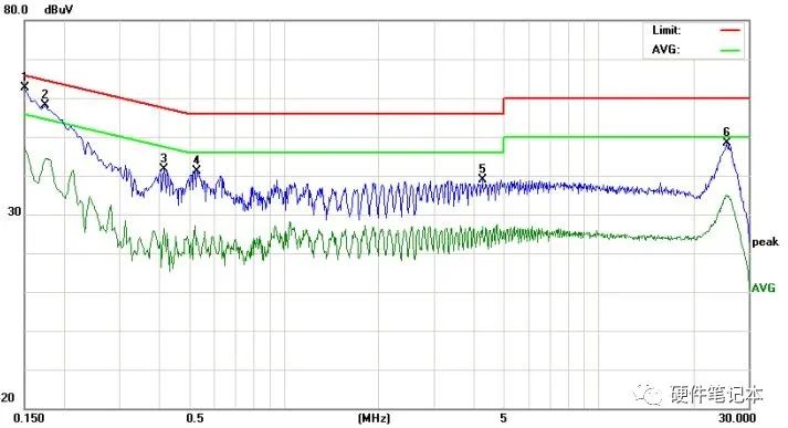 1、短接L2,L1=4.7mH,C1=0.1uf,C2=0.1uf,120V电压输入,L线传导图像: