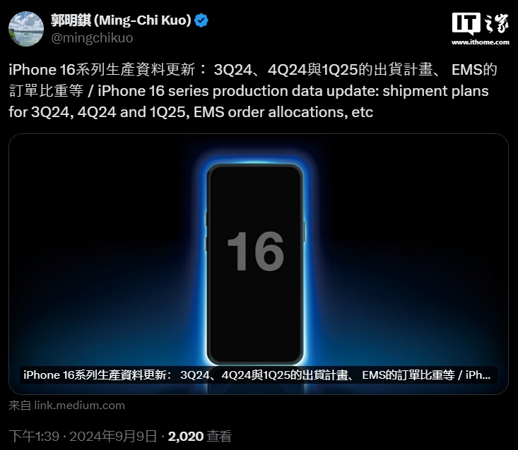 IT之家 9 月 9 日消息,天风国际分析师郭明錤今日发布 iPhone 16 / Pro 系列生产报告,苹果公司将 2024 年 iPhone 16 系列出货预估从 8700~8800 万部上调至 8800~8900 万部,主要增量来自 iPhone 16 标准版。